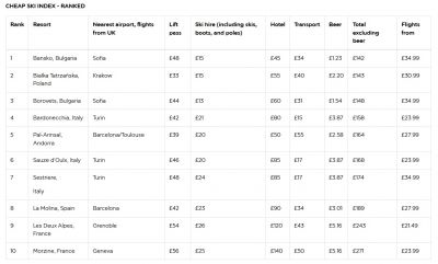 Банско оглавява класацията. Курортът предлага широка мрежа от писти, красива планинска природа и автентичен стар град, защитен от ЮНЕСКО. Скиорите могат да наемат обувки за ски за 15 паунда на ден, а бирата струва само 1 паунд, което прави курорта достъпен и за кратки почивки, се изтъква в класацията.