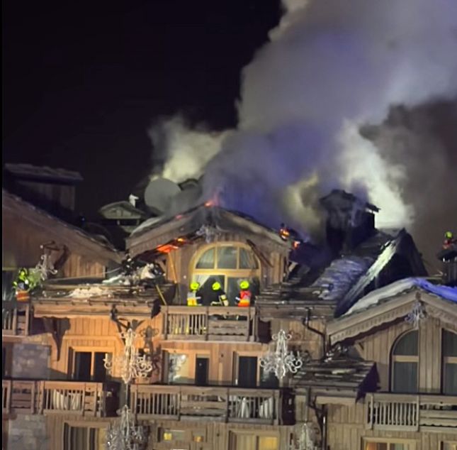 Пожарът избухна около 19:00 часа във вторник на тавана на хотел Des Grandes Alpes, чиито стаи се предлагат за около 11 000 паунда на нощ.