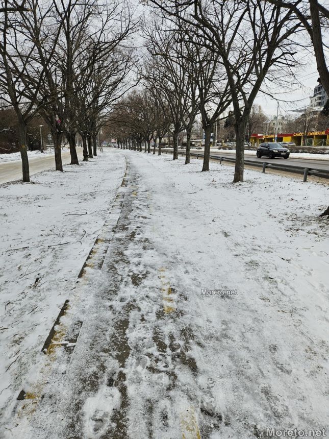 Същото важи и за велоалеята, която върви успоредно на бул. „Левски“ по протежение на бул. „Осми приморски полк“, където снегът и ледът също не са отстранени.