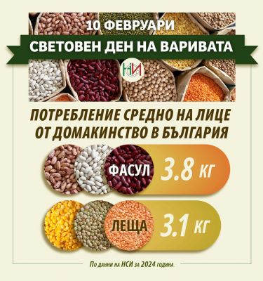 Националният статистически институт (НСИ) отбелязва Световния ден на варивата с инфографика, представяща потреблението на тези храни в България. Данните показват, че през 2024 година средното годишно потребление на фасул на човек от домакинство е 3,8 кг, а на леща – 3,1 кг.
