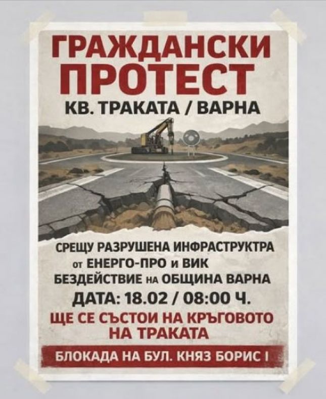Жители на местността Траката край Варна ще излязат на протест заради сериозното влошаване на инфраструктурата в района, особено след изпълнението на проект на ВиК. Недоволството е насочено към състоянието на улиците, които според хората са в опасно състояние и застрашават безопасността на живеещите там.