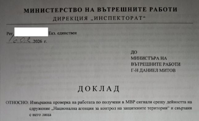 Комисия от Дирекция „Инспекторат“ към МВР са изготвили доклад за извършената проверка на сигнали, свързани със сдружение „Национална агенция за контрол на защитените територии“, свързано със случая "Петрохан"...