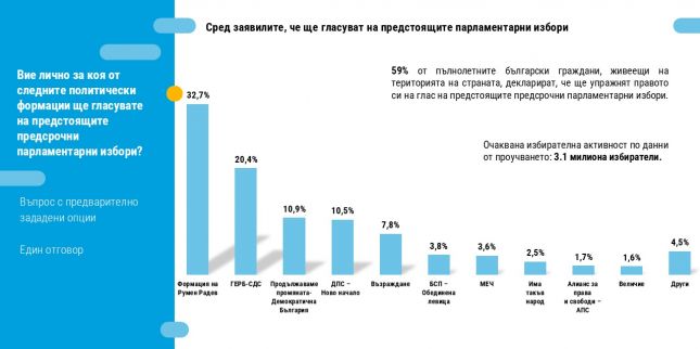 Лидер в подредбата е новата формация на Румен Радев, която събира подкрепата на 32.7% от гласуващите. Втори остават ГЕРБ-СДС с 20,4%. Очертава се неяснота за третото място, за което ще спорят ПП-ДБ (10,9%) и ДПС-Ново начало (10,5%). Възраждане е на пета позиция със 7,8% подкрепа сред гласуващите. Близо до бариерата остават БСП (3,8%), както и МЕЧ (3,6%). „Има такъв народ“ може да разчита на 2,5%, Алиансът за права и свободи разполага с 1,7%, а Величие има подкрепата на 1,6% сред гласуващите.