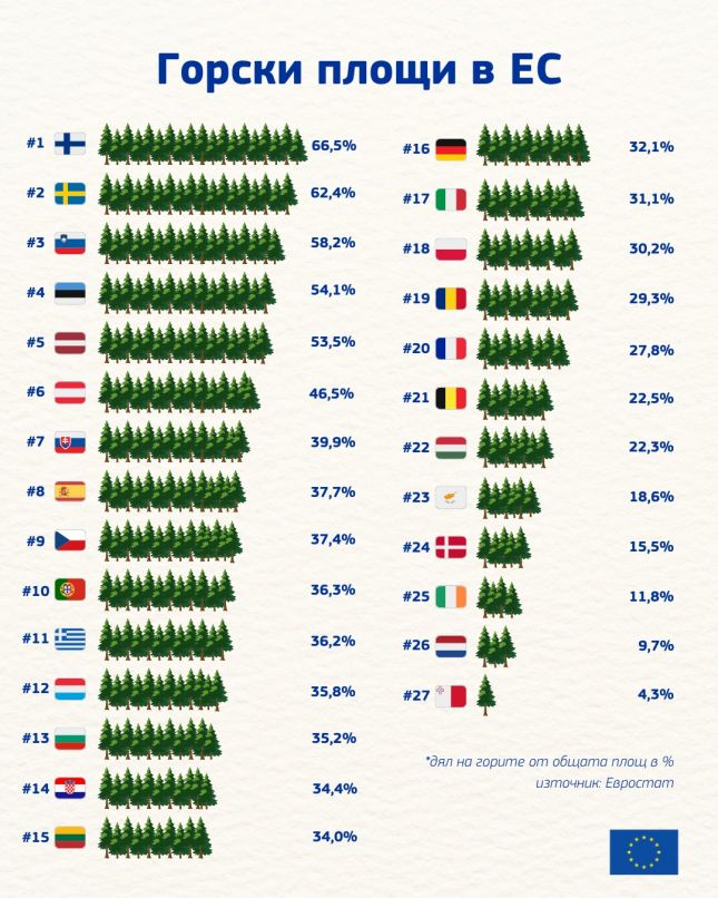 Горите заемат близо 40% от територията на Европейския съюз, показват данни на Eurostat, обобюени от Европейската комисия в България. Страната ни заема 13-о място в ЕС с 35,2% горски площи, което я поставя в средата на класацията. За сравнение, страната ни изпреварва големи икономики като Германия (32,1%), Италия (31,1%) и Франция (27,8%).