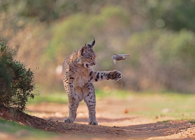 Фотографът прекарва няколко дни в укритие, когато младият хищник внезапно се появява с плячката си и започва да я хвърля във въздуха, улавяйки я отново и отново. В продължение на близо 20 минути рисът остава напълно погълнат от играта, като в определени моменти се изправя на задните си крака и наблюдава внимателно гризача.