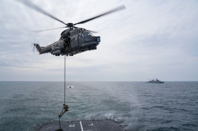 Като част от учението „Морски щит“ румънската армия симулира и сценарий, при който екипажите на фрегати се нуждаят от спешна подкрепа. Помощта идва от въздуха. Командоси се спускат с въжета от хеликоптер „Пума Навал“ (Puma Naval) директно върху движещата се фрегата „Крал Фердинанд“.