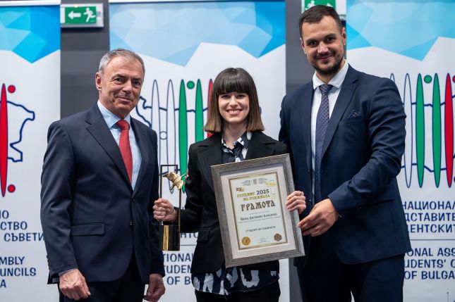 Големият приз „Студент на годината - 2026“ беше връчен на Ивана Дилянова Каменова от Университета по архитектура, строителство и геодезия от проф. Сергей Игнатов - министър на образованието и науката, както и от Ангел Стойков - председател на Националното представителство на студентските съвети.
