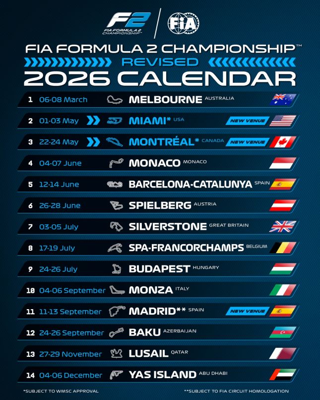 Формула 2 обяви важна промяна в календара за сезон 2026, като ще се присъедини към уикендите на Формула 1 в Маями и Канада. Решението идва като компенсация за отменените кръгове в Бахрейн и Саудитска Арабия.