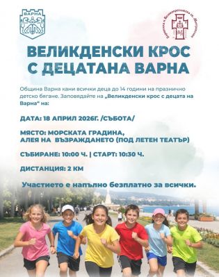 Община Варна кани всички деца до 14 години да се включат в празничното бягане „Великденски крос с децата на Варна“, което ще се проведе на 18 април, събота, в Морската градина.