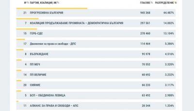 Междинните резултати от изборите за Народно събрание към 07:00 часа на 20 април, при обработени 68,34% от протоколите, показват убедителна преднина за Прогресивна България с 44,49%.