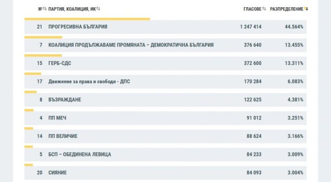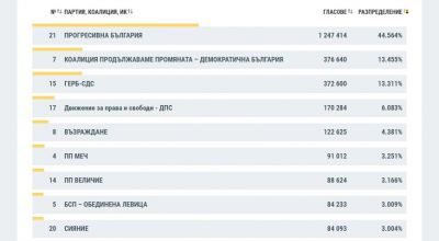 Междинните данни на ЦИК към 09:00 часа на 20 април, при обработени 87,23% от протоколите на секционните комисии, показват, че Прогресивна България запазва убедителна преднина с 44,56%.