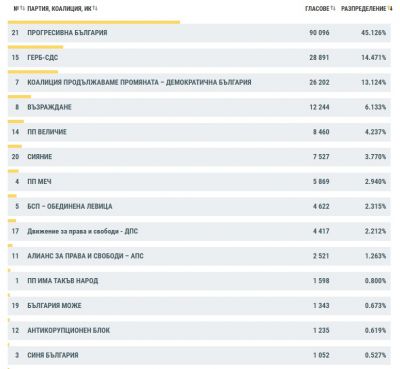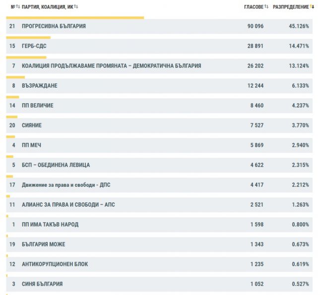 „Прогресивна България“ е първа политическа сила с 45.126%. На второ място се нарежда ГЕРБ-СДС с 14.471%, а трети са „Продължаваме промяната – Демократична България“ с 13.124%.