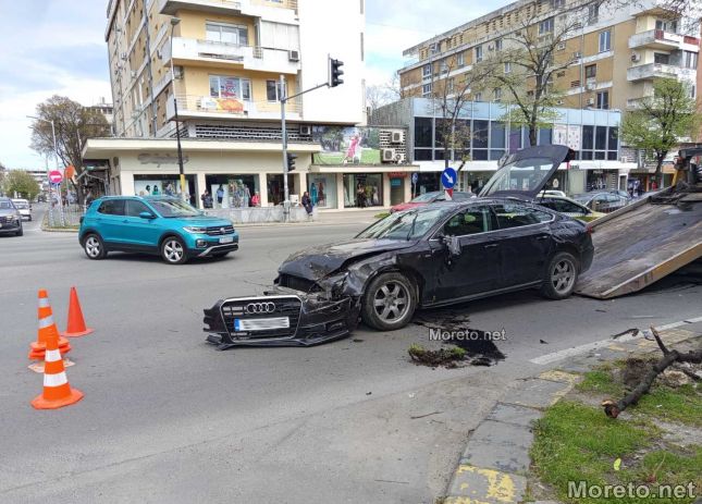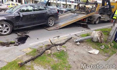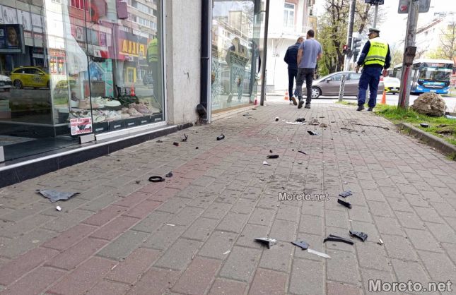 При удара колата е изкъртила предпазно колче, а части от катастрофиралото превозно средство се забелязваха по тротоара.
