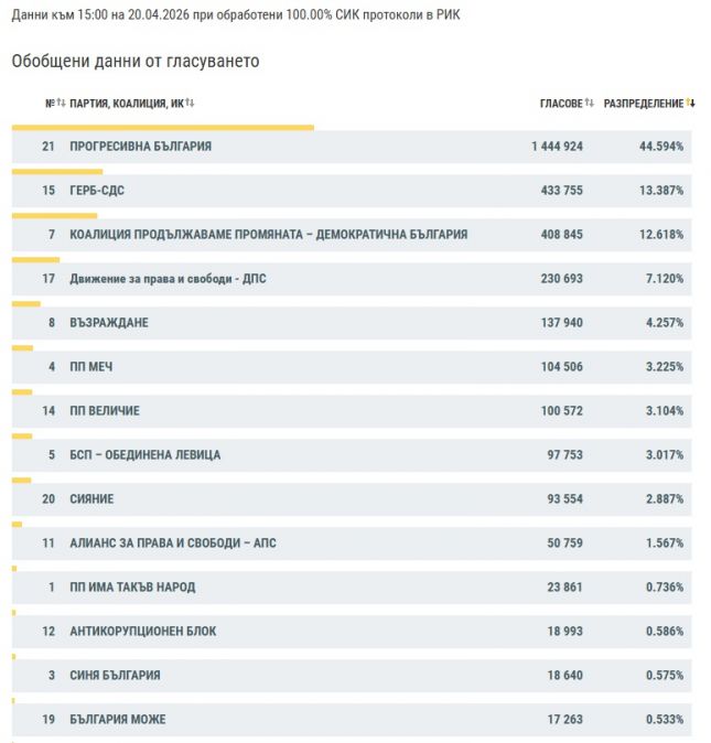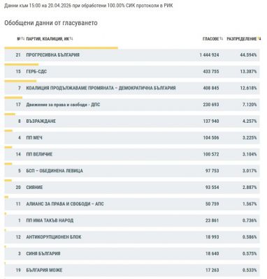 Според обработени 100% протоколи на секционните избирателни комисии в районните избирателни комисии, в следващия парламент влизат пет формации - "Прогресивна България", ГЕРБ-СДС, ПП-ДБ, ДПС и "Възраждане".