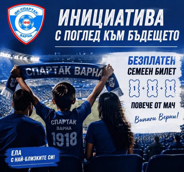 Спартак Варна обяви нова инициатива, насочена към връщането на публиката на стадиона. Клубът въвежда за първи път безплатен семеен билет в ограничени бройки, който ще бъде предоставян на деца от школата и на ученици от различни училища, за да могат да поканят своите родители и близки на мач.