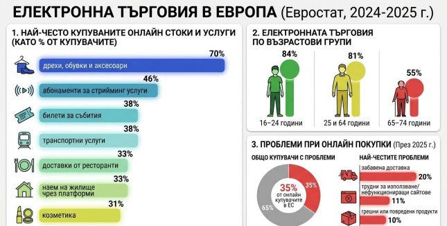 През 2025 г. делът на интернет потребителите, които са закупили стоки или услуги през интернет през предходните 12 месеца, е варирал от 57% в България и 62% в Италия до 94% в Нидерландия и 95% в Ирландия, показва справка на Moreto.net