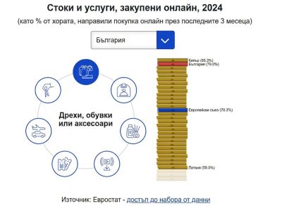 Въпреки по-ниската обща активност, българските потребители следват европейската тенденция за силен интерес към модата. Данните показват, че 79% от онлайн купувачите в България са поръчвали дрехи, обувки или аксесоари – ниво, което нарежда страната сред водещите в ЕС, показват данни на Евростат.