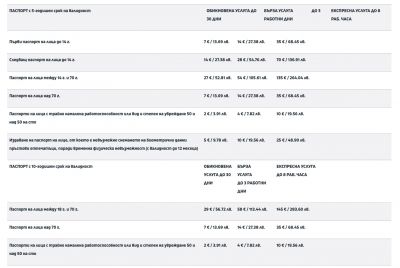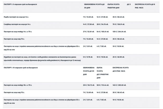 Таксата за издаване на паспорта с 10-годишна валидност е малко по-висока от тази за документа със срок на действие 5 години за лица на възраст между 18 и 70 години, показва справка в сайта на МВР. Там са публикувани цените на всички услуги.