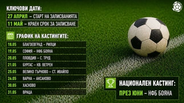 От днес, 27 април, започват записванията за кастингите за Академията БФС, съобщиха от футболната централа. Крайният срок за кандидатстване е 11 май.