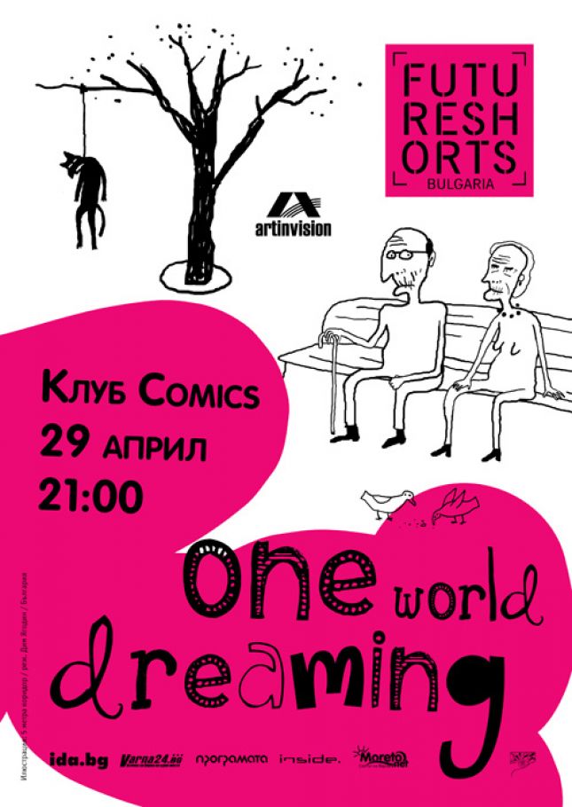 Априлската програма на Future Shorts продължава с програмата "ONE WORLD DREAMING". Тя включва филми като култовия “Тeleglobal Dreamin`”, спечелил награда от фестивала SXSW, историята за мъчителна загуба на разсъдък в “Терминус“, разкрити фантазии в Ще изчакам следващият“ и кризата на юношеството от “Не ме зарязвай у дома“, а незабравимата Кейт Буш с разказ за група музиканти ще ви напомни как да oсвободите собствените си мечти.