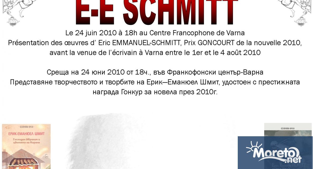 Алианс франсез - Варна в сътрудничество в Представителството на Френския институт-София във Варна организират литературно ателие „Франкофоливр”, посветено на произведенията на Ерик-Еманюел Шмит, удостоен с награда Гонкур за 2010 за новелата” Кончерто в памет на един ангел”. Това събитие ще се състои в четвъртък, 24 юни 2010 от 18 ч. във Франкофонски център-Варна.