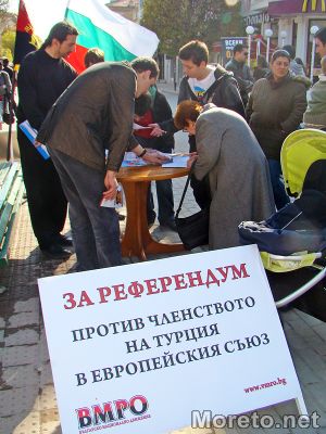 ВМРО внесе в парламента над 320 000 подписа с искане за национален референдум относно позицията на страната по въпроса с кандидатурата на Турция за членство в Европейския съюз. Според закона 200 000 подписа са нужни, за да задължат Народното събрание да насрочи дебат, на който да се реши дали да се проведе референдум. ВМРО ще проведе срещи с всички парламентарни групи с изключение на ДПС. Целта е депутатите да бъдат запознати с аргументите защо такъв референдум трябва да се насрочи.