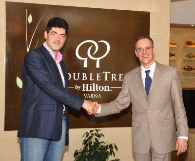 Георги Велчев (вляво) и мениджърът на “Хилтън” във Варна Клаудио Стурм се поздравяват за влизането на "Хилтън" на Българското Черноморие
