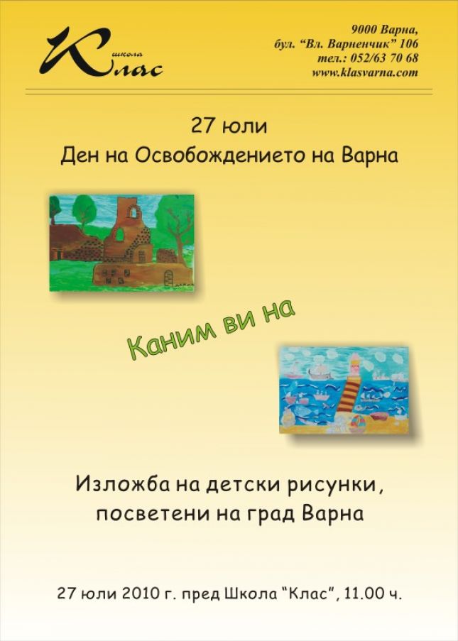 Децата и екипът на Школа „Клас” Ви канят на изложба, посветена на 27 юли – денят на Освобождението на града ни от турската власт. Откриването е на 27 юли от 11:00 часа пред школата.