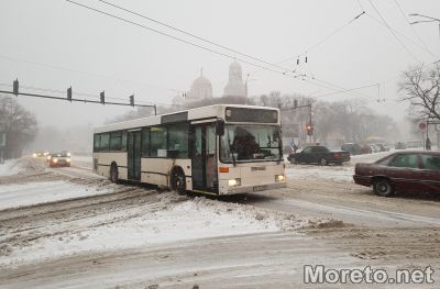 Зима, сняг, спирка, градски транспорт, автобуси