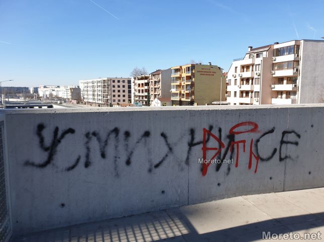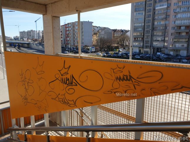 "Най-украсена" с различни надписи бе пасарелката зад "Гранд мол". Драсканиците личат от метри и не спират да възмущават пешеходците.